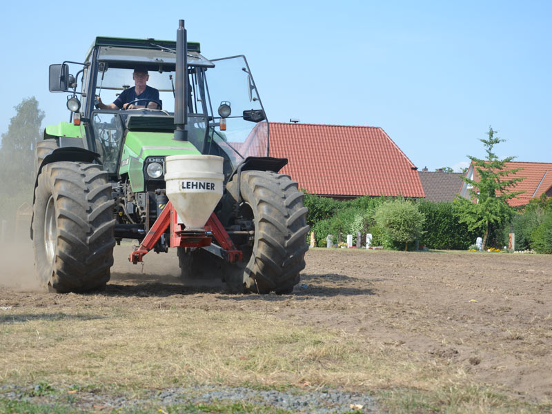 Plum, Helling und Hahn hatten im vergangenen Jahr die „Initiative Bienen-Blühstreifen Burgwedel-Isernhagen“ (IBBBI) ins Leben gerufen, um dem dramatischen Rückgang der Insektenpopulation etwas entgegenzusetzen. Seither konnten sie bereits vier Projekte verwirklichen – so auch in dieser Woche auf dem Kirchenfriedhof St. Marien Isernhagen. Rund 1.200 Quadratmeter Reservefläche stellt die evangelische Kirchengemeinde hier für einen Blühstreifen zur Verfügung; entgegen früheren Erwartungen wird diese Fläche aktuell nicht für eine Erweiterung des Friedhofes gebraucht. Friedel Könecke, Landwirt aus Isernhagen, bereitete die Fläche in mehreren Einsätzen vor und brachte als letzten Arbeitsschritt das Saatgut mit Trecker und Sämaschine aus. Zuvor hatte es noch eine kleine Schrecksekunde gegeben: Die für die Aussaat eingeplante Drillmaschine passte nicht durchs Friedhofstor. Trecker und aufgesetzte Sämaschine taten es dann aber auch.