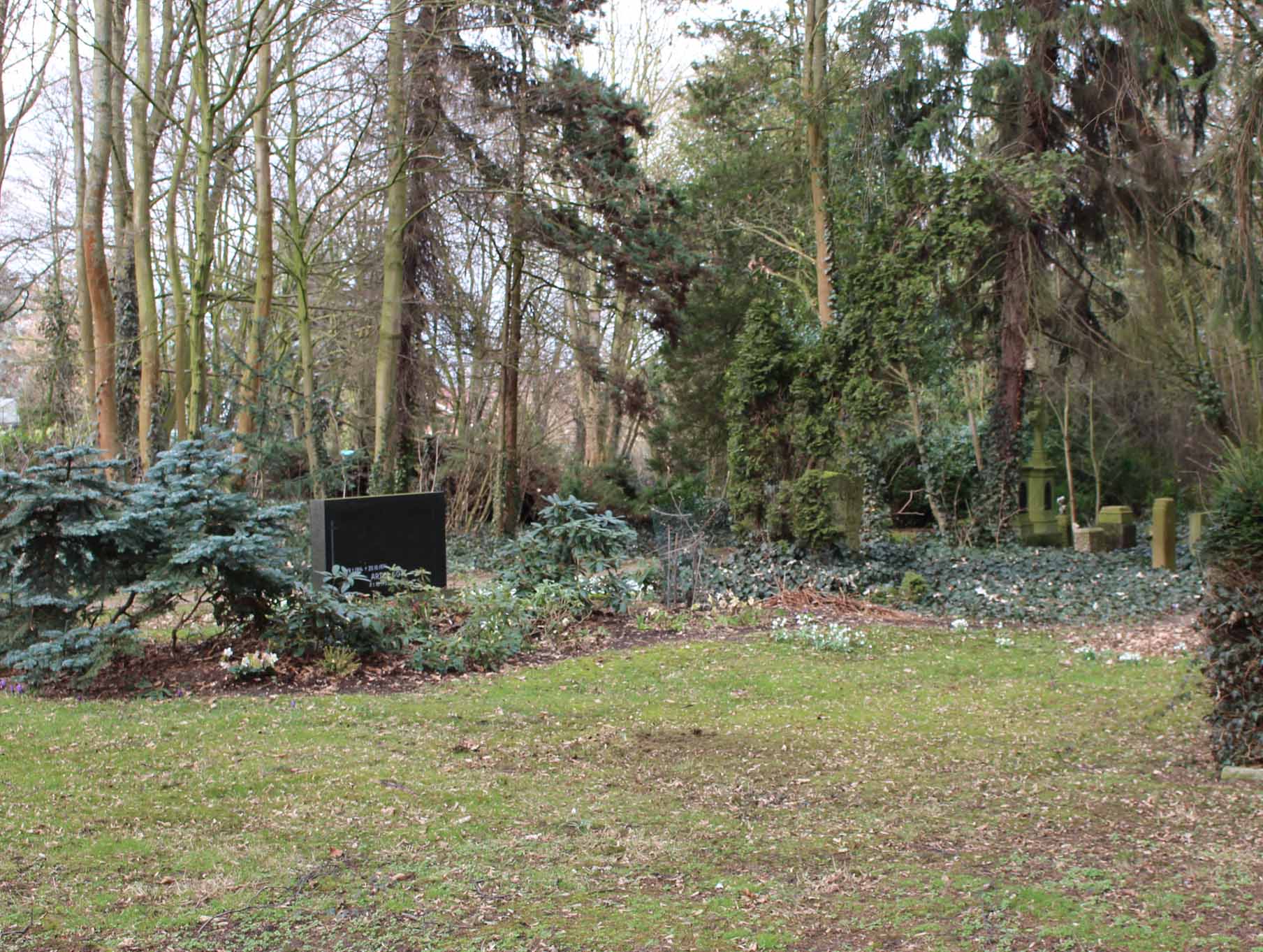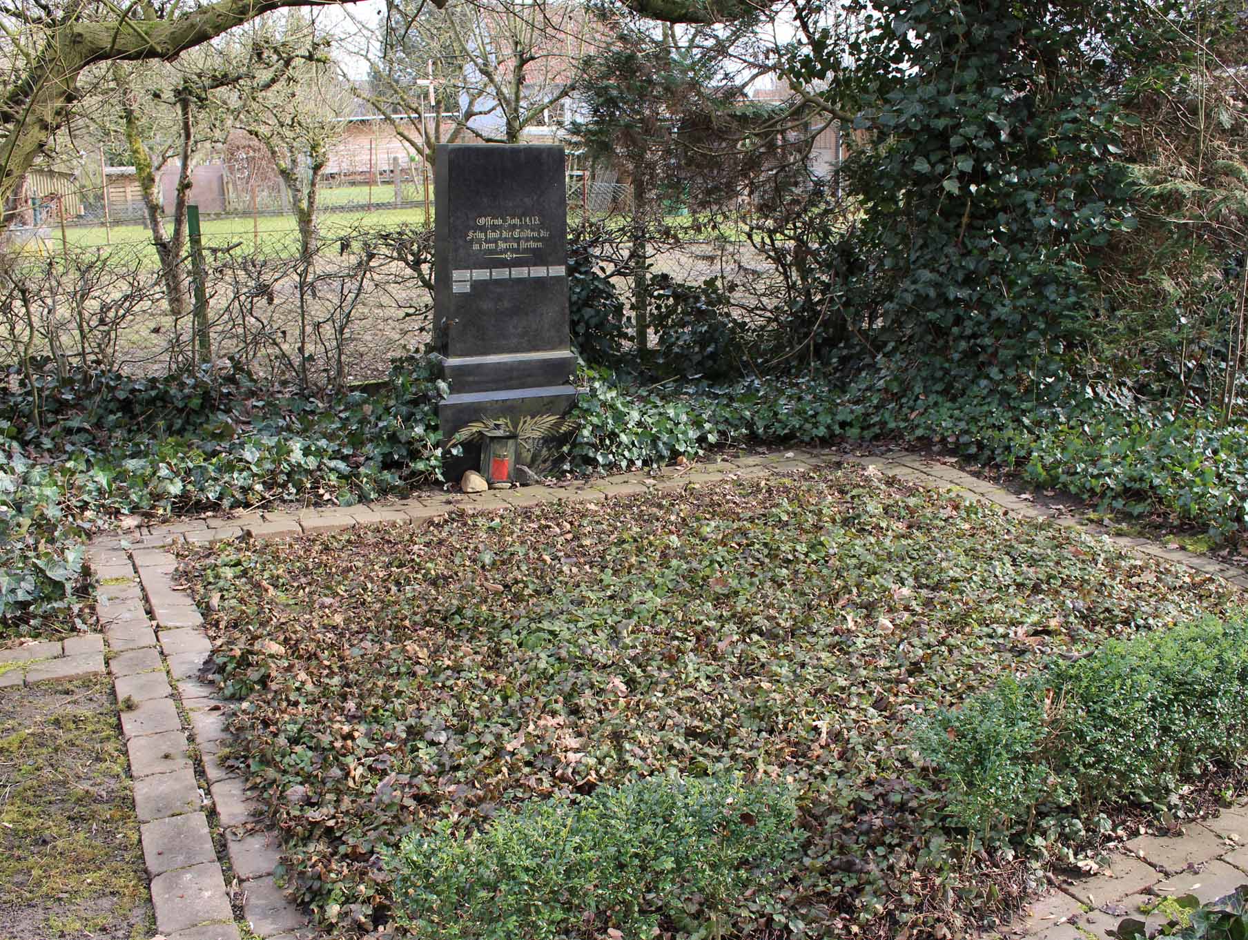 Gräber in der Gemeinschaftsgrabanlage für Urnenbestattungen können wie Wahlgräber frei ausgesucht werden. Sie sind mit Bodendeckern bepflanzt und werden von der Kirchengemeinde gepflegt.