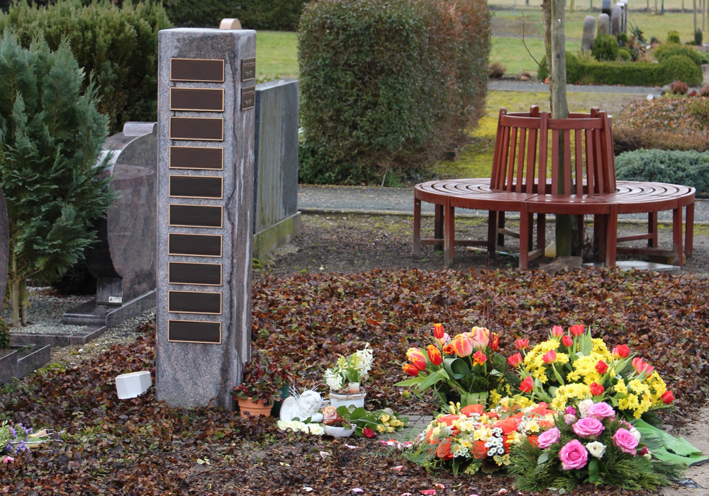 In der Anlage ist ein zentrales Denkmal aufgestellt, auf dem mit einer Bronzetafel der Vor- und Nachname sowie das Geburts- und Sterbejahr angebracht sind. Die Gebühren hierfür sind bereits im Nutzungsrecht enthalten.