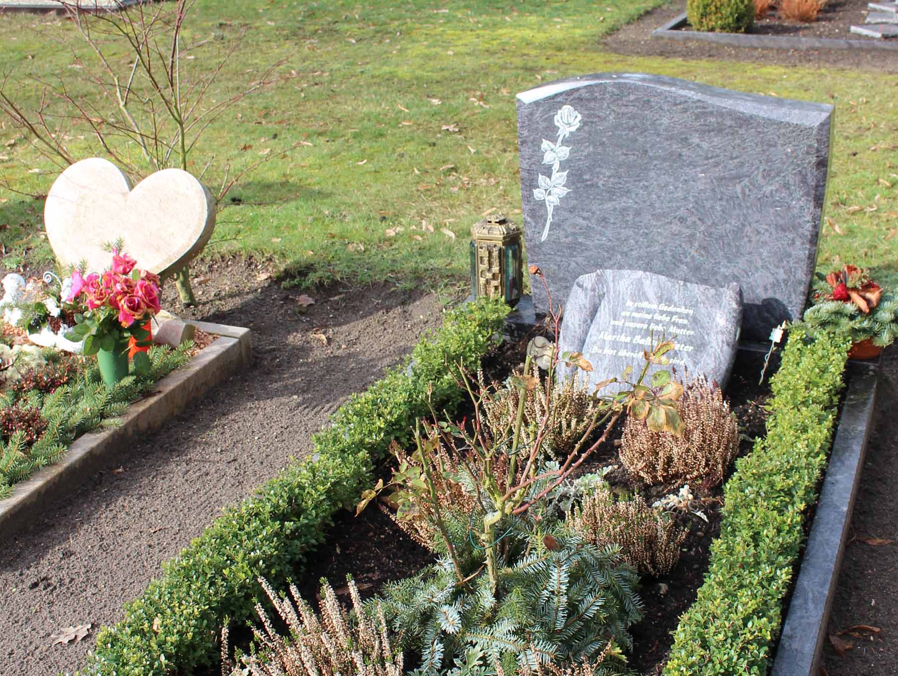 Eine Verlängerung ist einmalig möglich. Auf der Grabstätte ist ein Grabmal auf einem Sockel zu errichten.