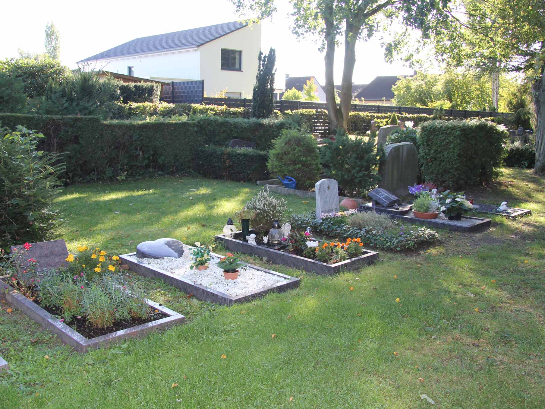 Ein Rasenreihengrab im Rasengräberfeld wird einzeln und der Reihe nach für eine Urnenbeisetzung vergeben. Die Pflege wird von der Kirchengemeinde übernommen.