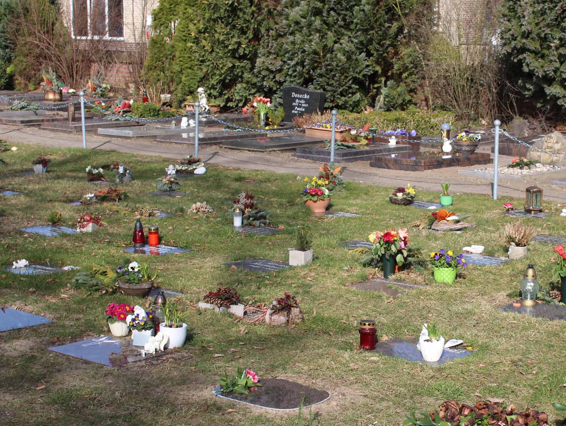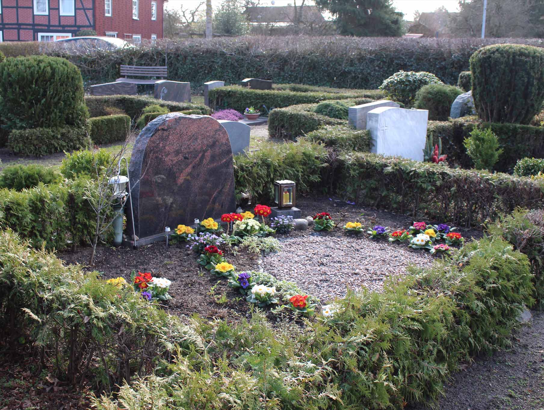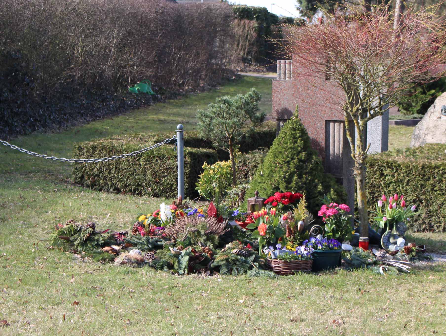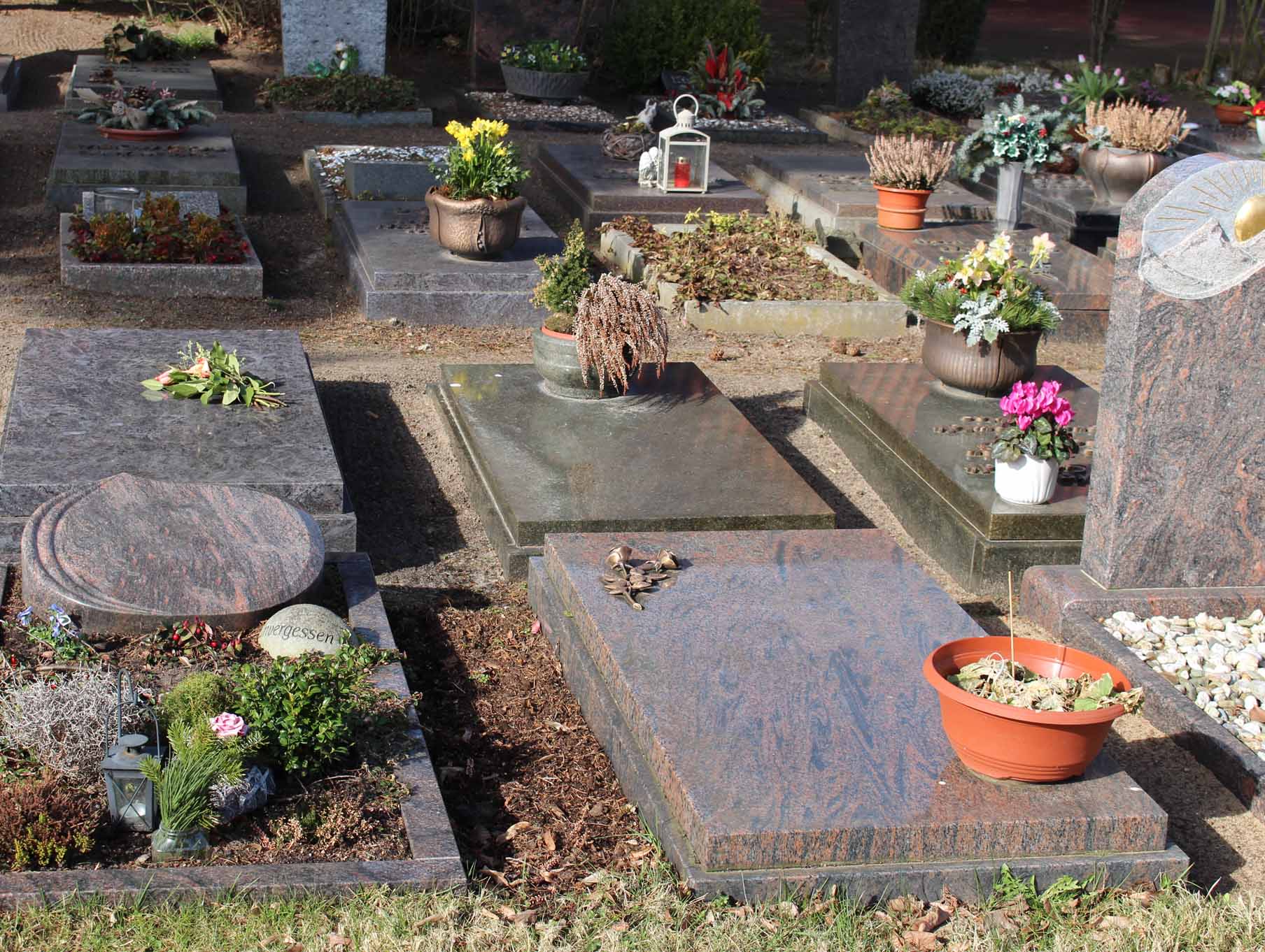 Grabstellen werden für Urnenbestattungen im Todesfall der Reihe nach vergeben und nicht einzeln eingefasst.