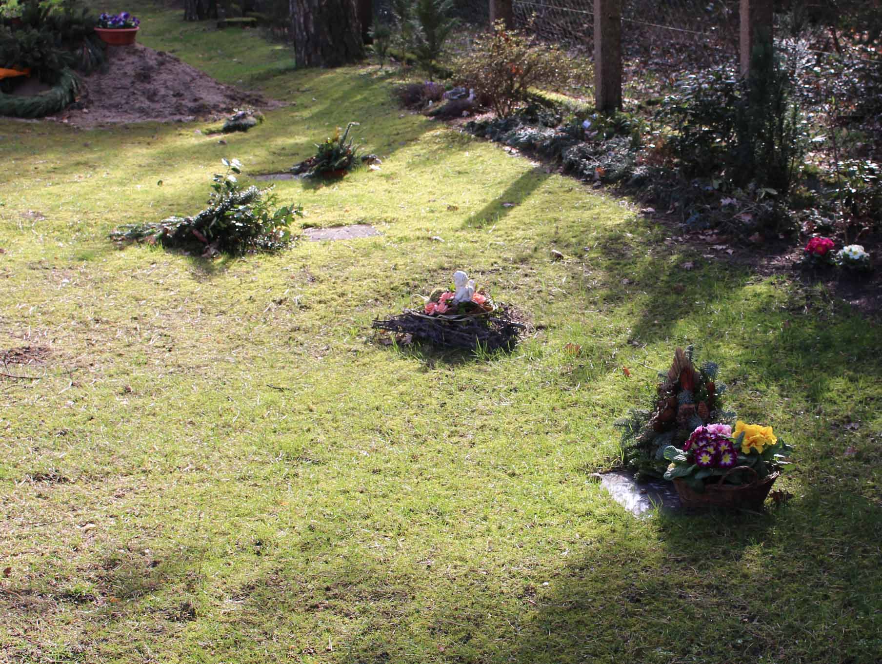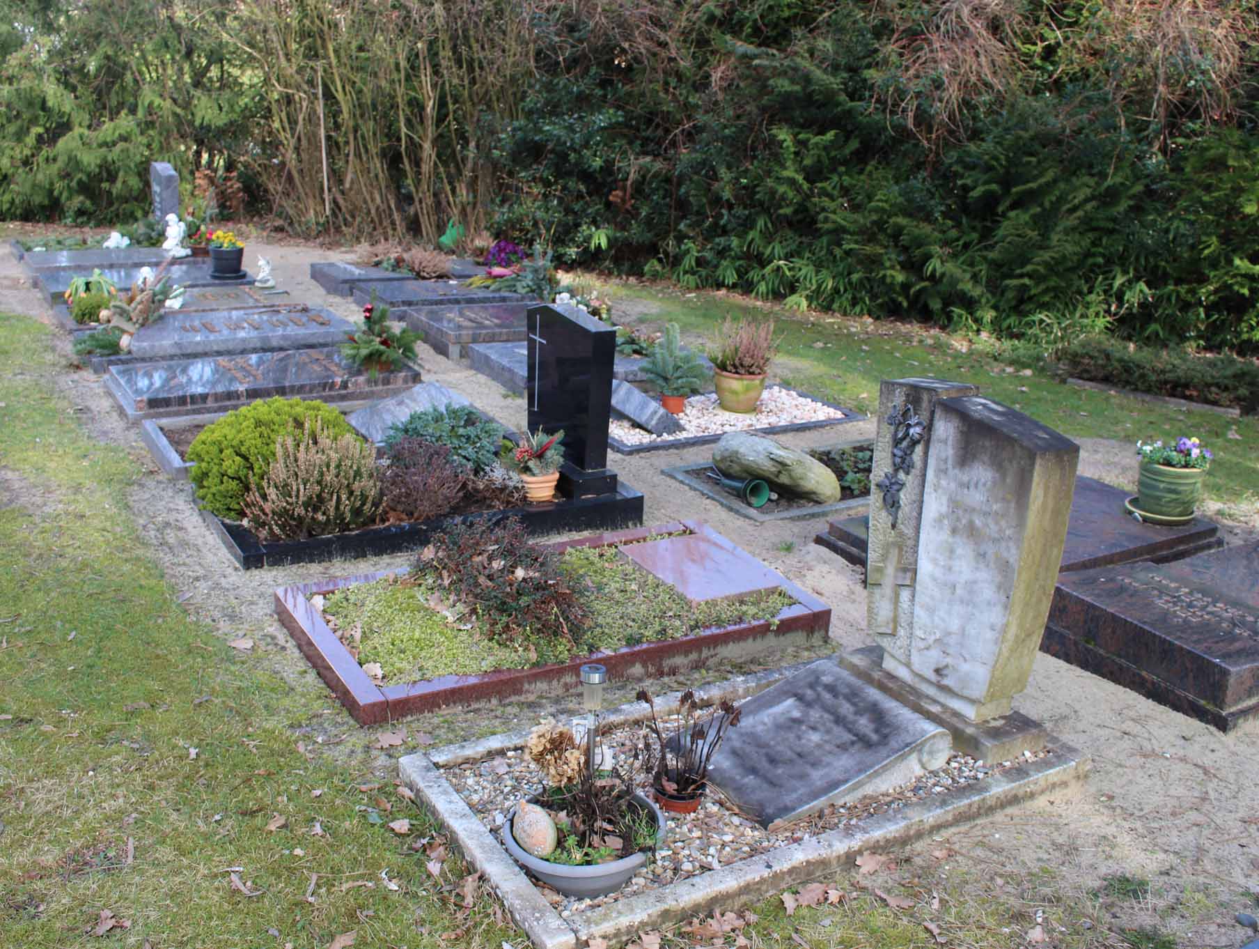 Grabstellen werden für Urnenbestattungen im Todesfall der Reihe nach vergeben und nicht einzeln eingefasst.