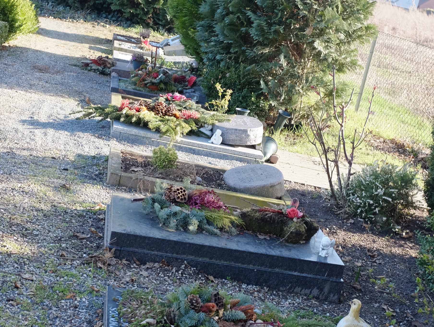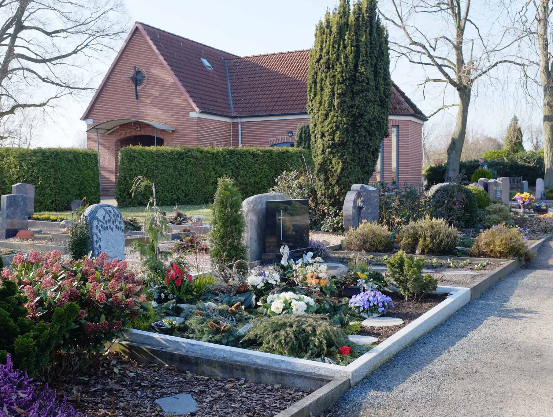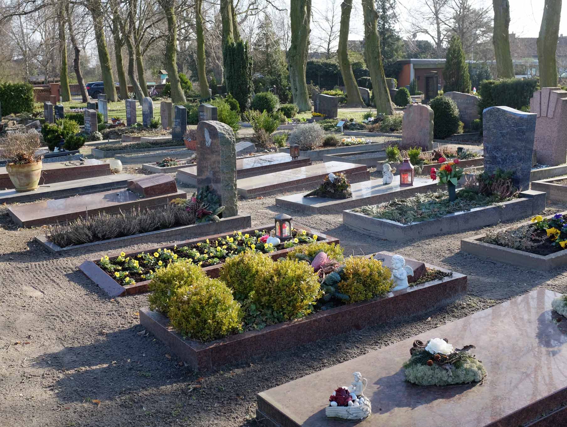 Für die Pflege und Unterhaltung der Grabstätten ist ausschließlich die Kirchengemeinde verantwortlich. Grabschmuck kann darüberhinaus im Pflanzstreifen aufgestellt oder abgelegt werden.