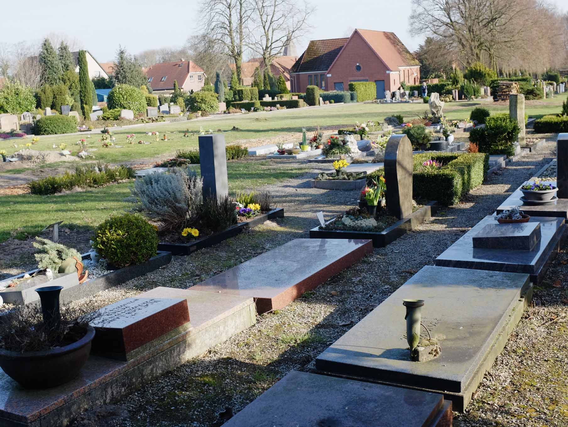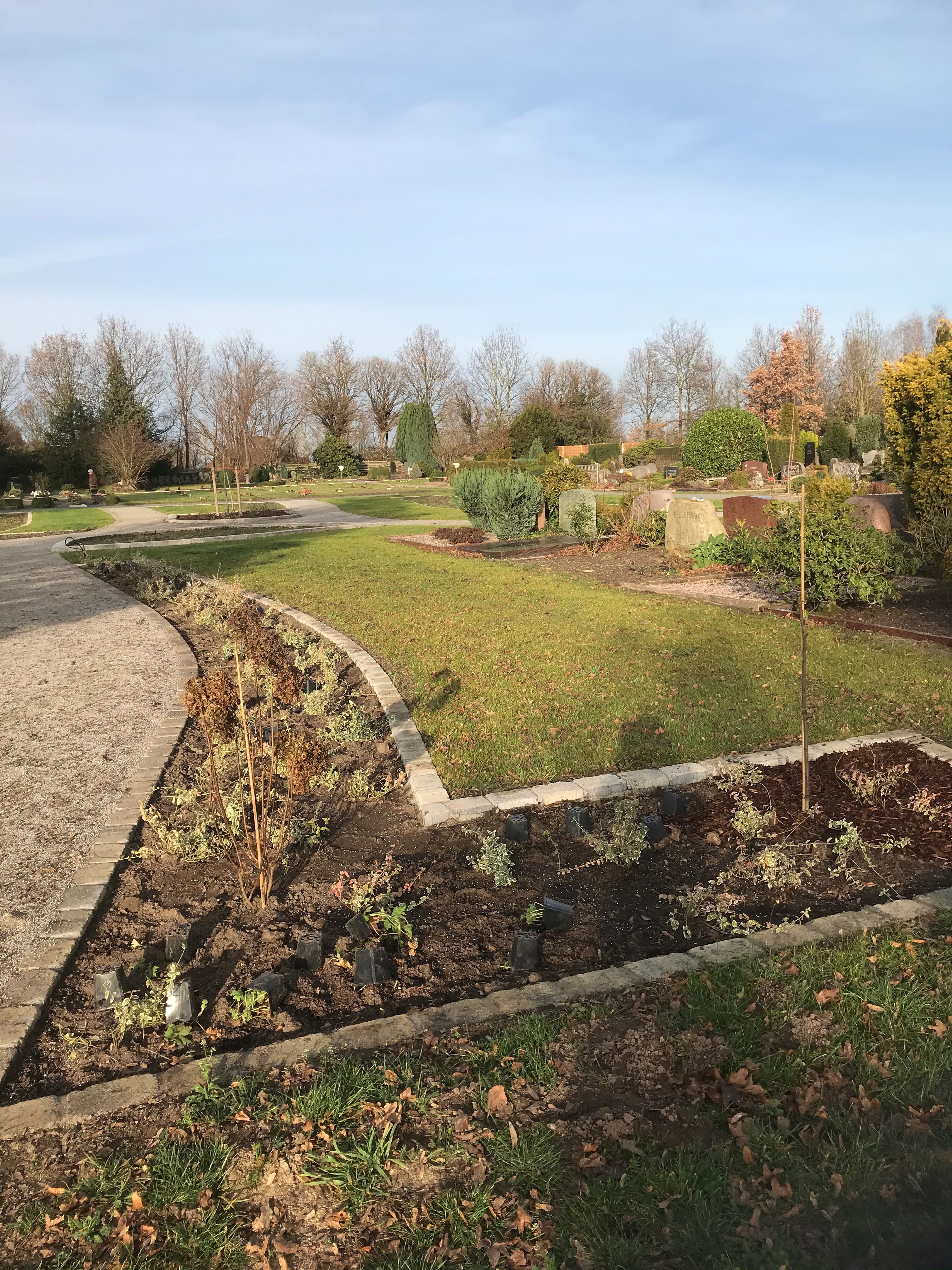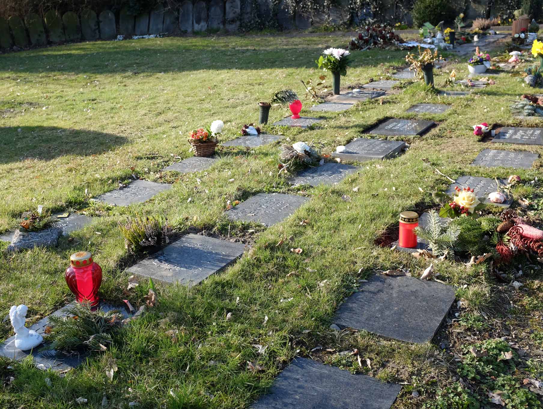 Für die Pflege und Unterhaltung der Grabstätten ist ausschließlich die Kirchengemeinde verantwortlich. Grabschmuck kann darüberhinaus im Pflanzstreifen aufgestellt oder abgelegt werden.