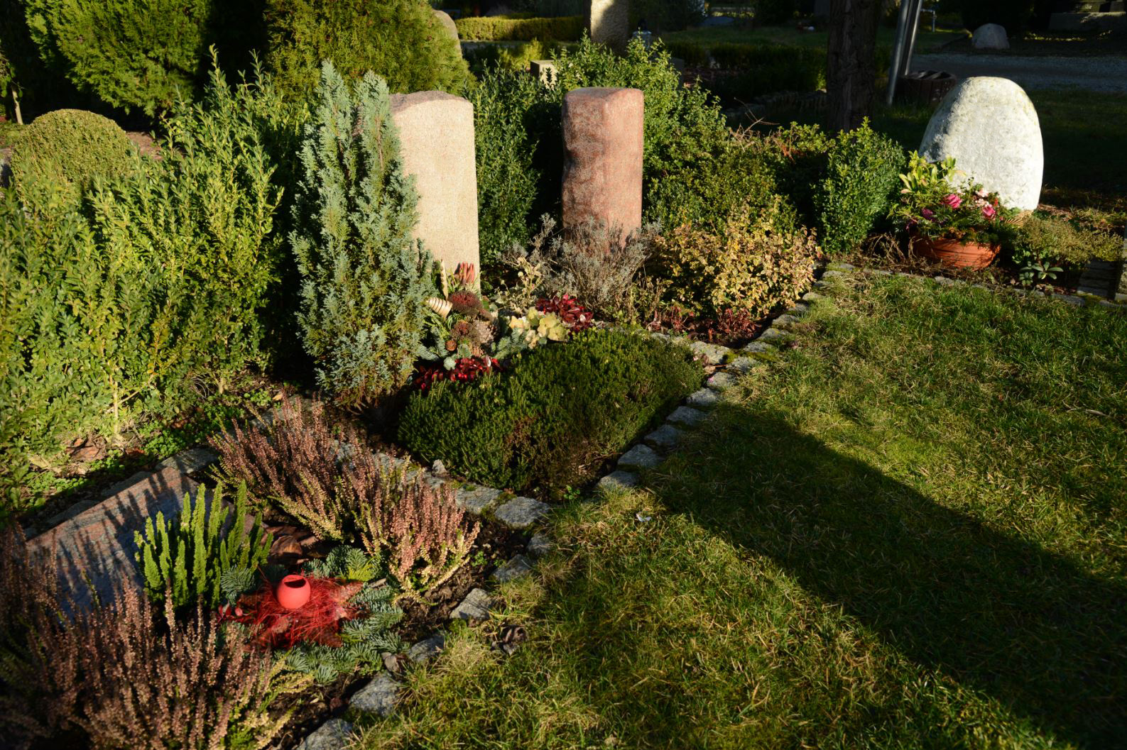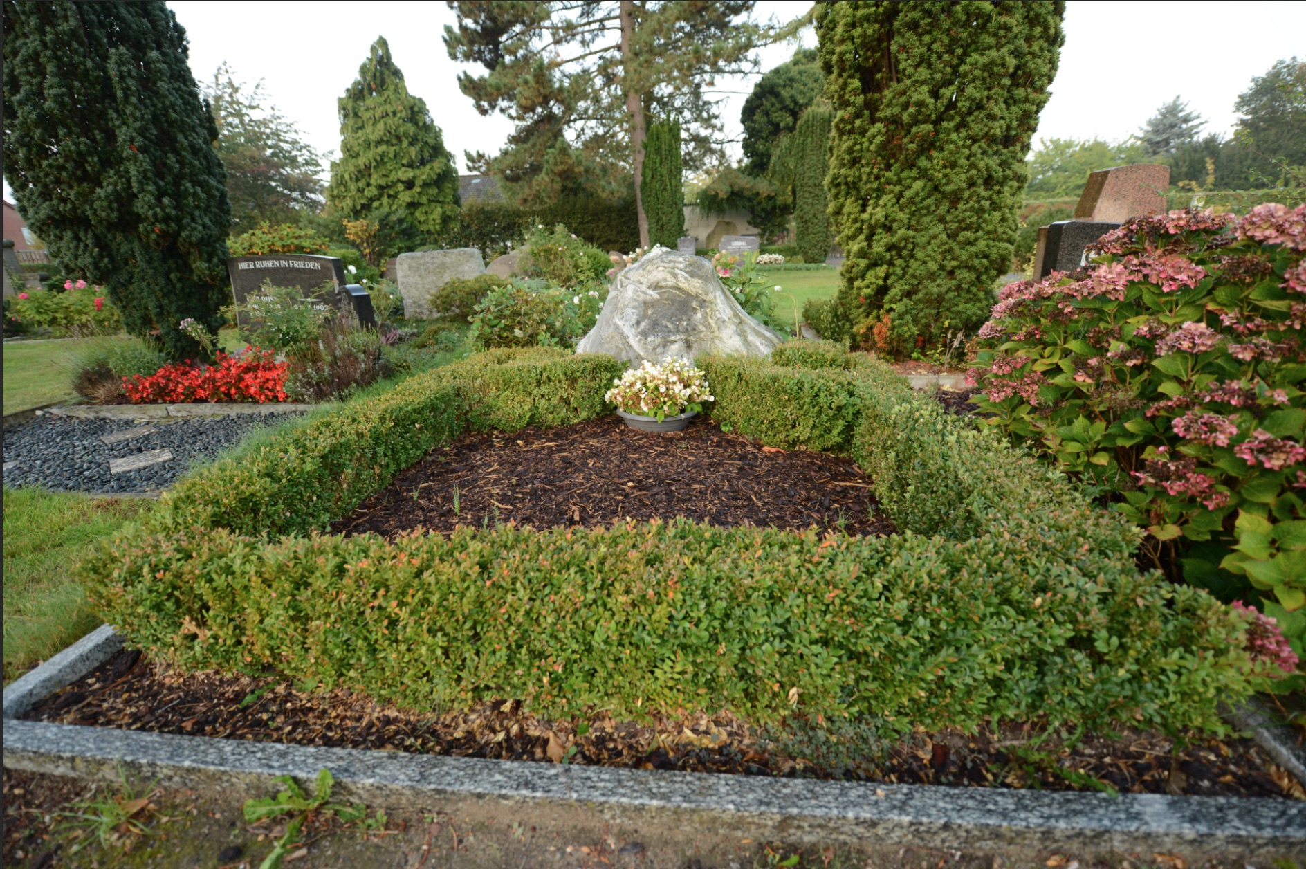 Die Anlage ist für den Nutzungsberechtigten pflegefrei. Die Gestaltung und Pflege wird von der Kirchengemeinde durchgeführt.