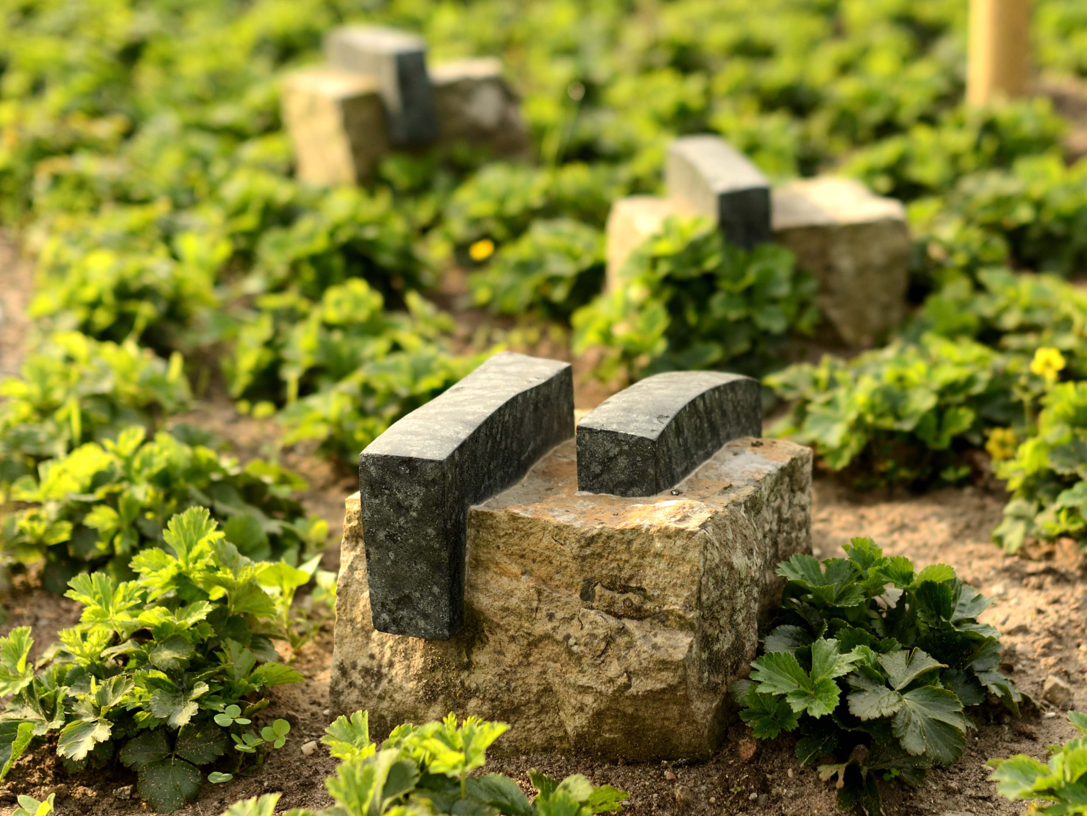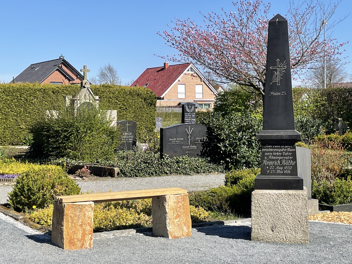 Im Ginkgo-Hain am Obelisken können wir Ihnen anbieten, sich zu Lebzeiten eine Grabanlage auszusuchen, sie ist mit Pflanzen, einem zentralen Gedenkstein, einer Bank und einem Grabmal gestaltet.