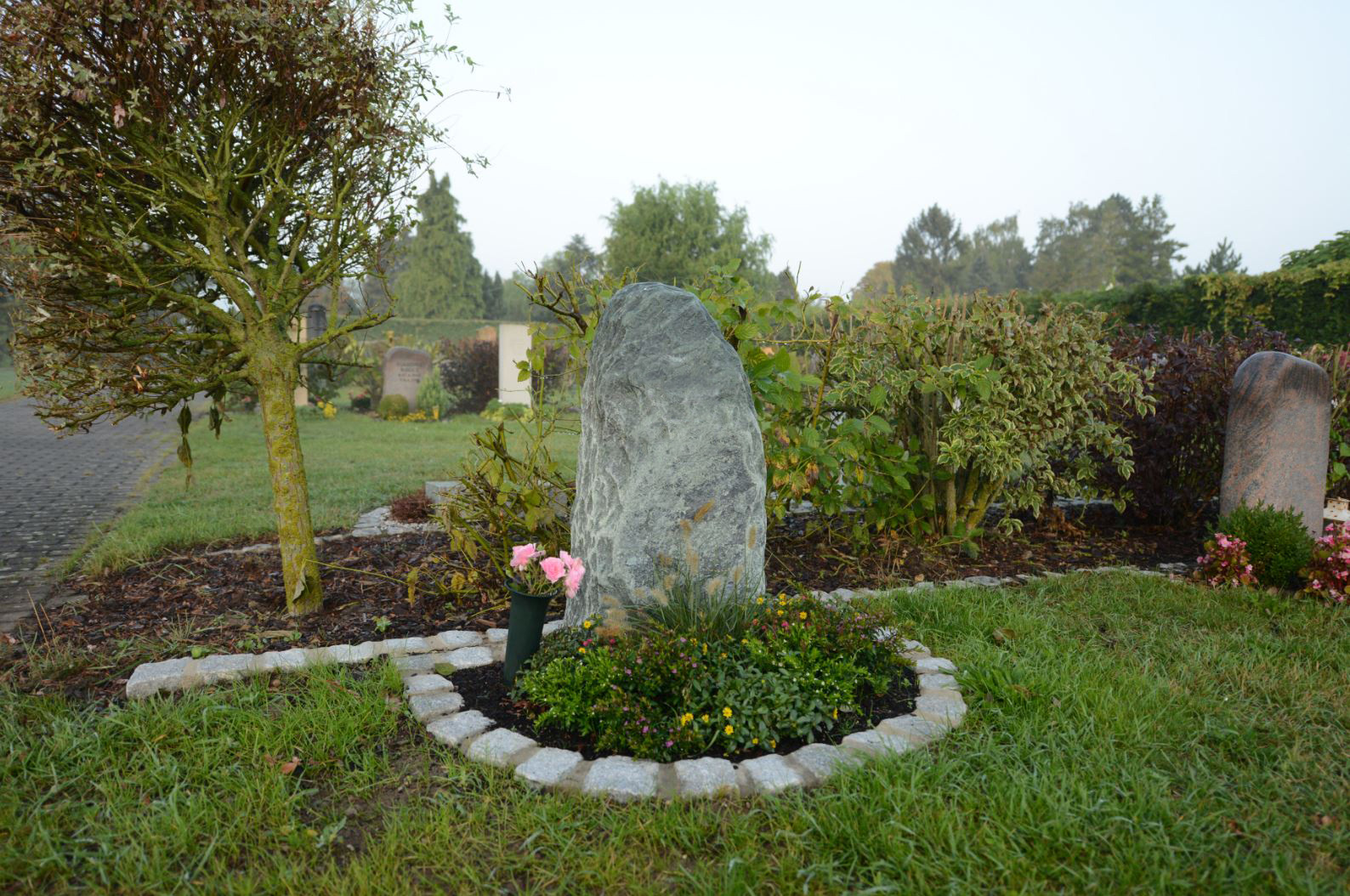 Vor dem Grabmal haben Sie die Möglichkeit ein kleine Pflanzfläche gestalten. Die Pflanzfläche ist mit einer übermähbaren Einfassung aus Quadersteinen begrenzt. Die Anlage ist mit Rasen eingesät.