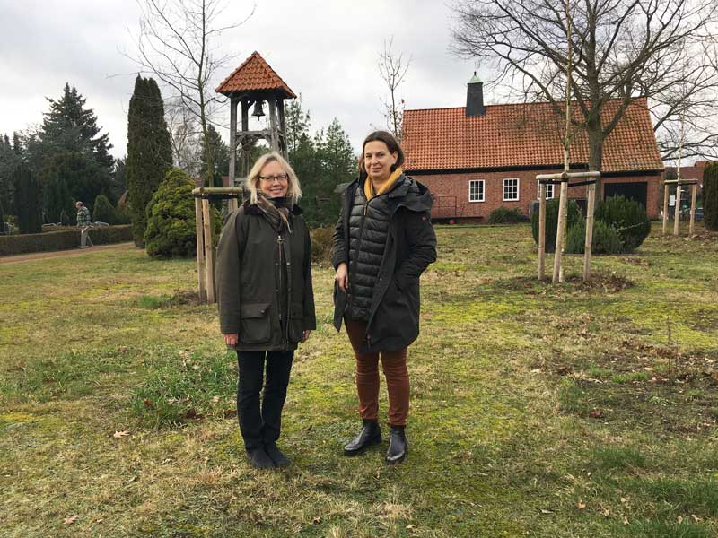 „Um unseren Friedhof ökologisch aufzuwerten, möchten wir gerne wegkommen von geharkten Flächen und der klassischen Wechselbepflanzung“, berichten Annette Hahne und Beate Meyer-Bothling weiter. Sie wünschen sich einen Wandel hin zu einer insektenfreundlichen Bepflanzung mit Stauden und planen für ein weiteres, bislang ungenutztes Rasenstück die Anlage einer Heidefläche und eines Bienenzaunes.